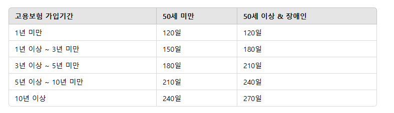퇴직 당시 연령과 고용보험 가입기간에 따라 지급일수가 다릅니다.